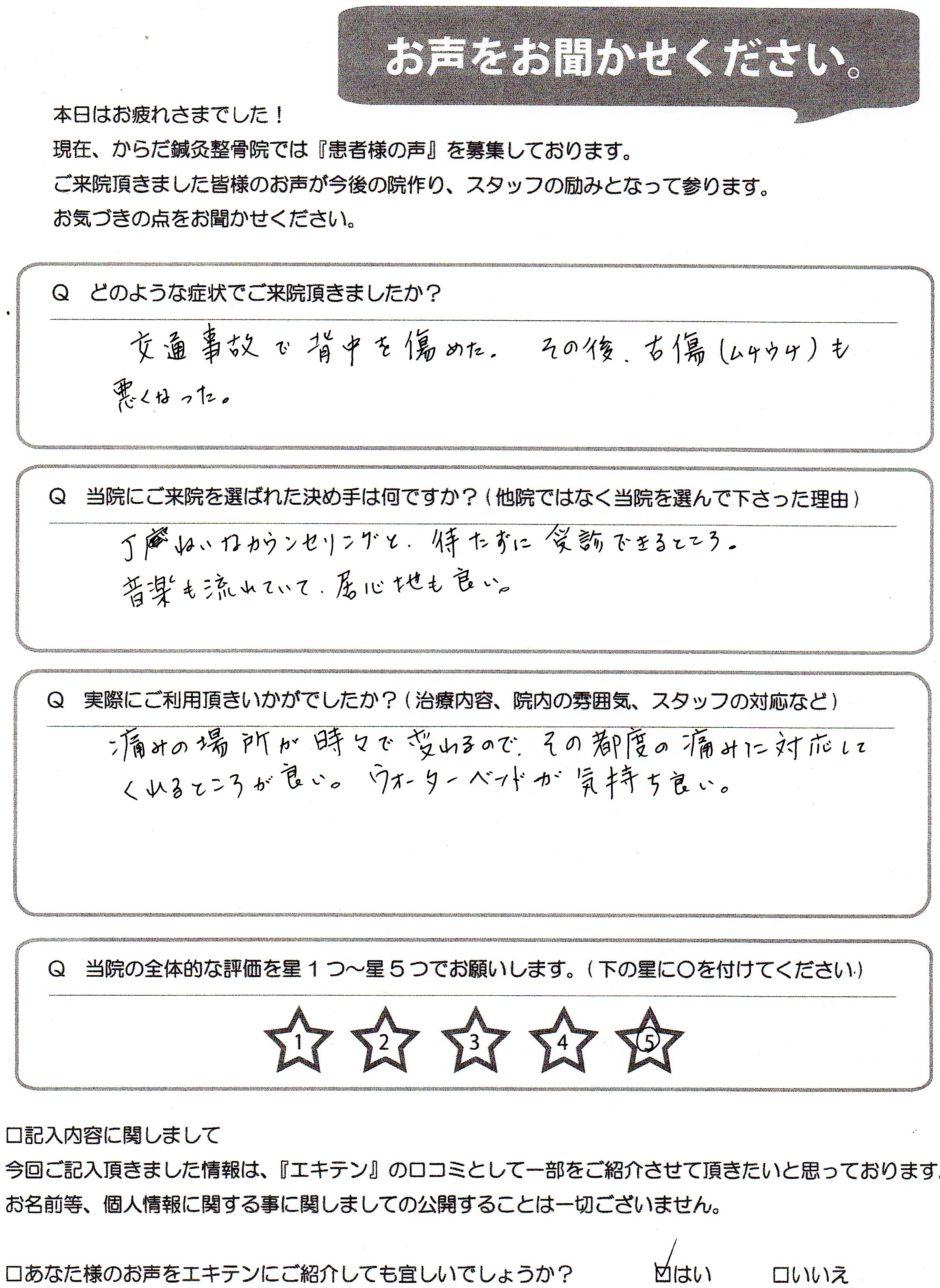 交通事故で背中を傷めた。その後、古傷(むち打ち)も悪くなった。