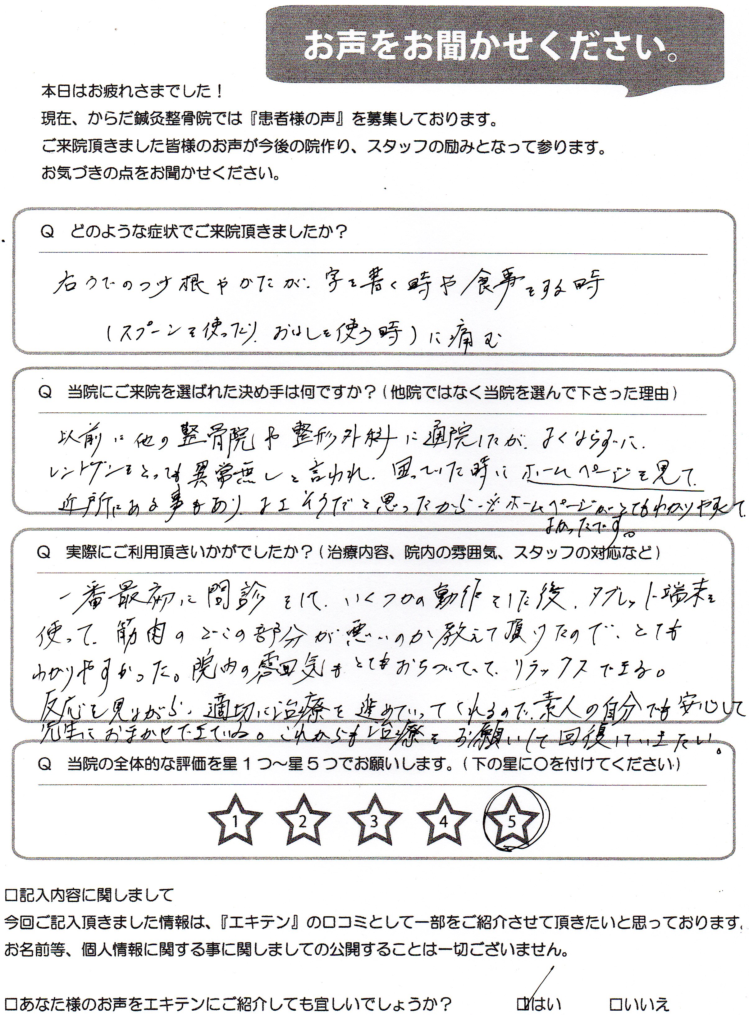 以前に他の整骨院や整形外科に通院したが良くならずにレントゲンを撮っても異常なしと言われ、困っていた時にホームページを見て、近所にある事もあり、良さそうだと思ったから(ホームページがとても見やすかったです。)