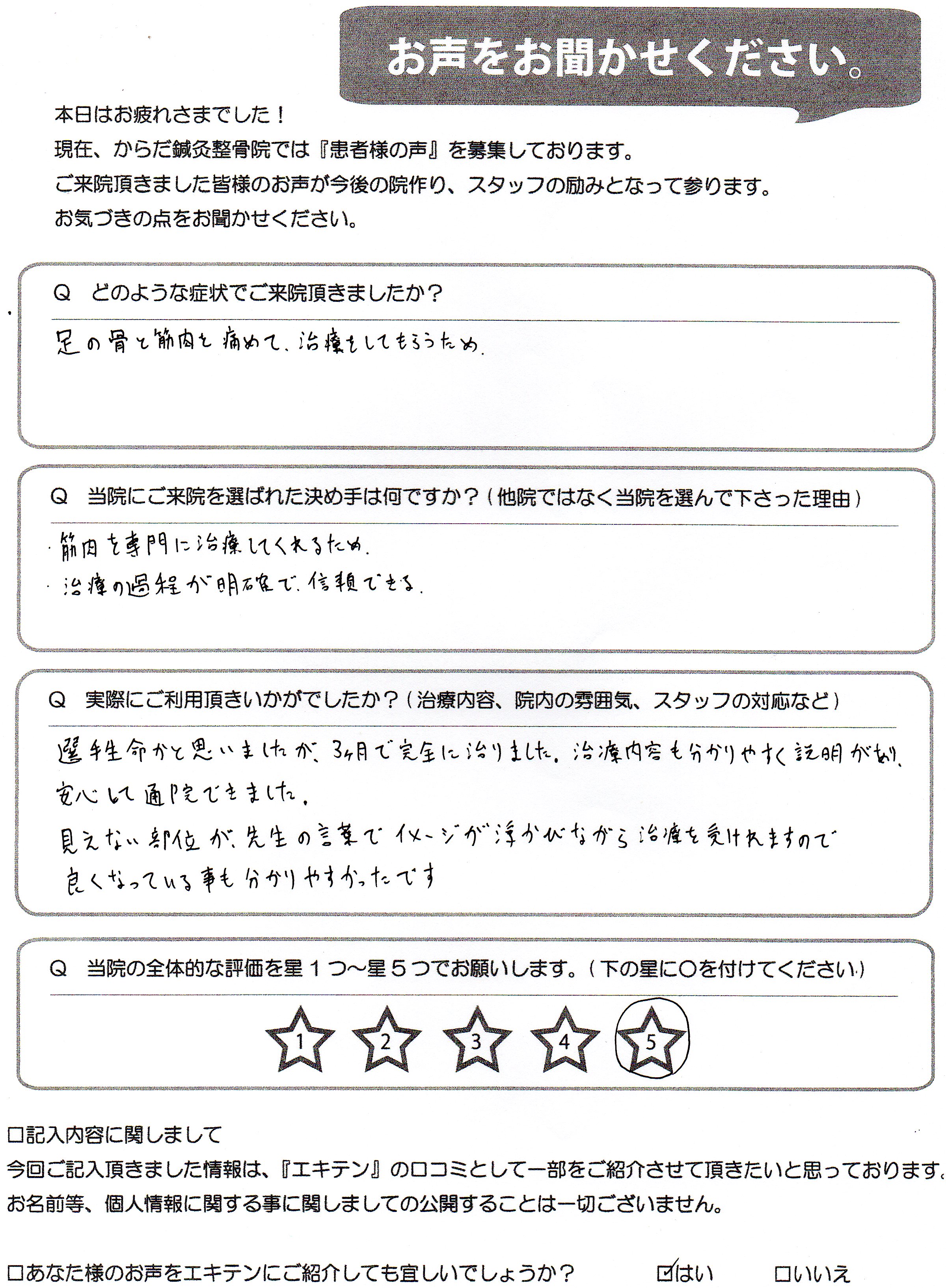 足の痛みが取れ、とても足が楽になり普段の生活にも支障がなくなりとても良かったです。