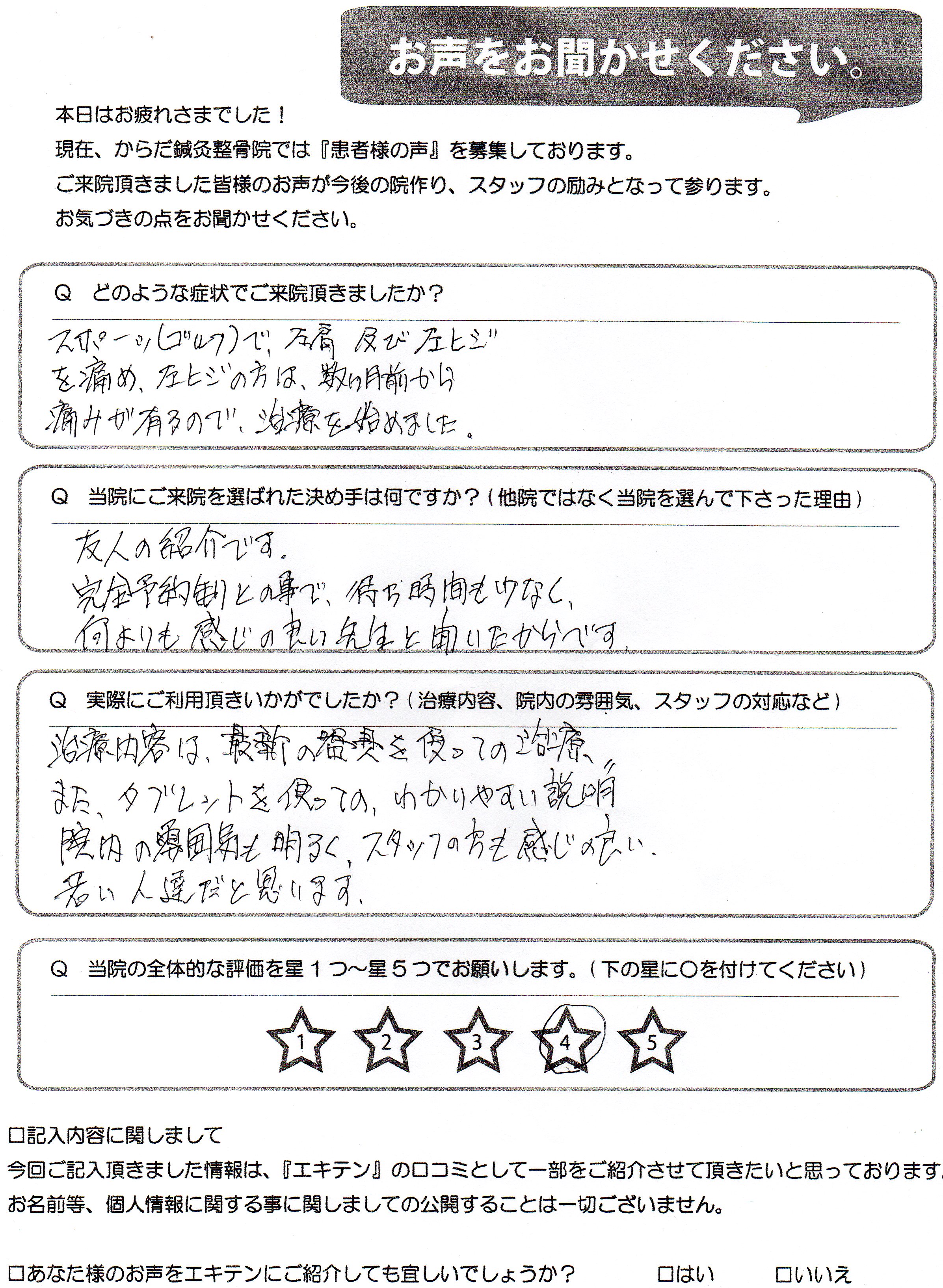 スポーツ(ゴルフ)で、左肩及び左ひじを痛め、左ひじは数ヶ月前から痛みがあるので、治療を始めました。