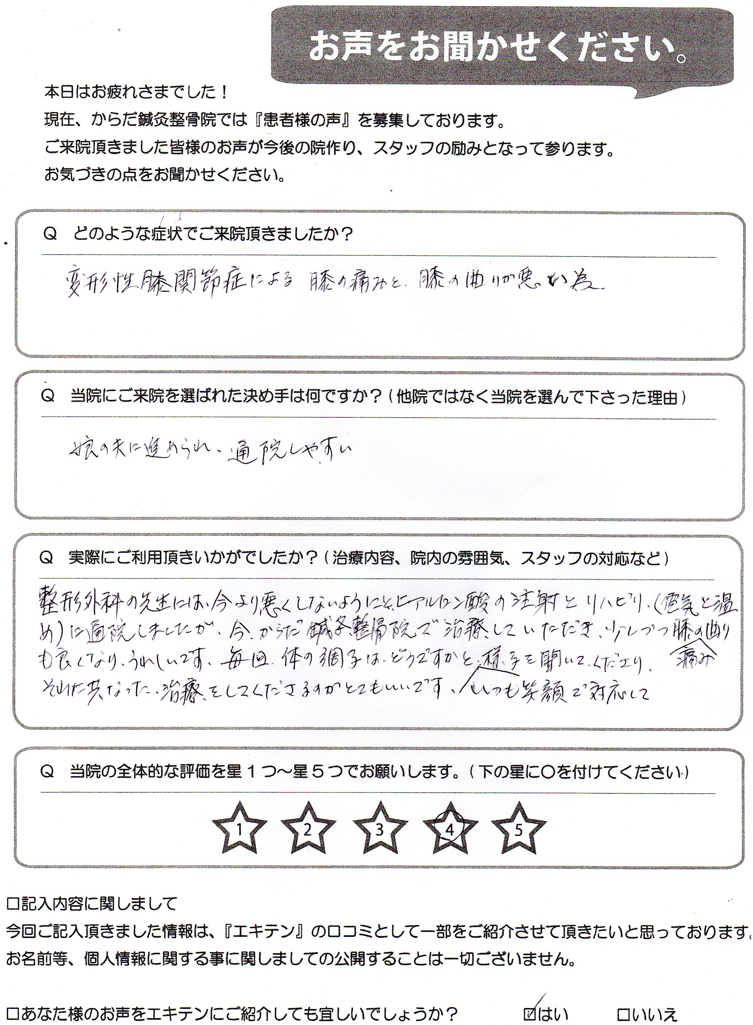 整形外科の先生には、今より悪くしないようにヒアルロン酸の注射とリハビリ(電気と温め)に通院しましたが、今からだ鍼灸整骨院で治療して頂き、膝の痛み、曲がりも良くなり、うれしいです。毎回、「体の調子はどうですか」といつも笑顔で対応して様子を聞いてくださり、それに伴なった治療をしてくださるのがとてもいいです。